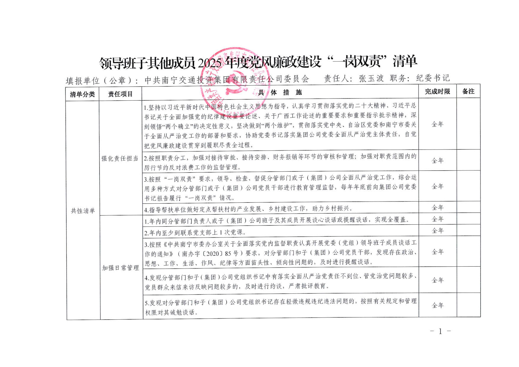 南寧交投集團領(lǐng)導(dǎo)班子其他成員2025年度黨風(fēng)廉政建設(shè)“一崗雙責(zé)”清單(一)