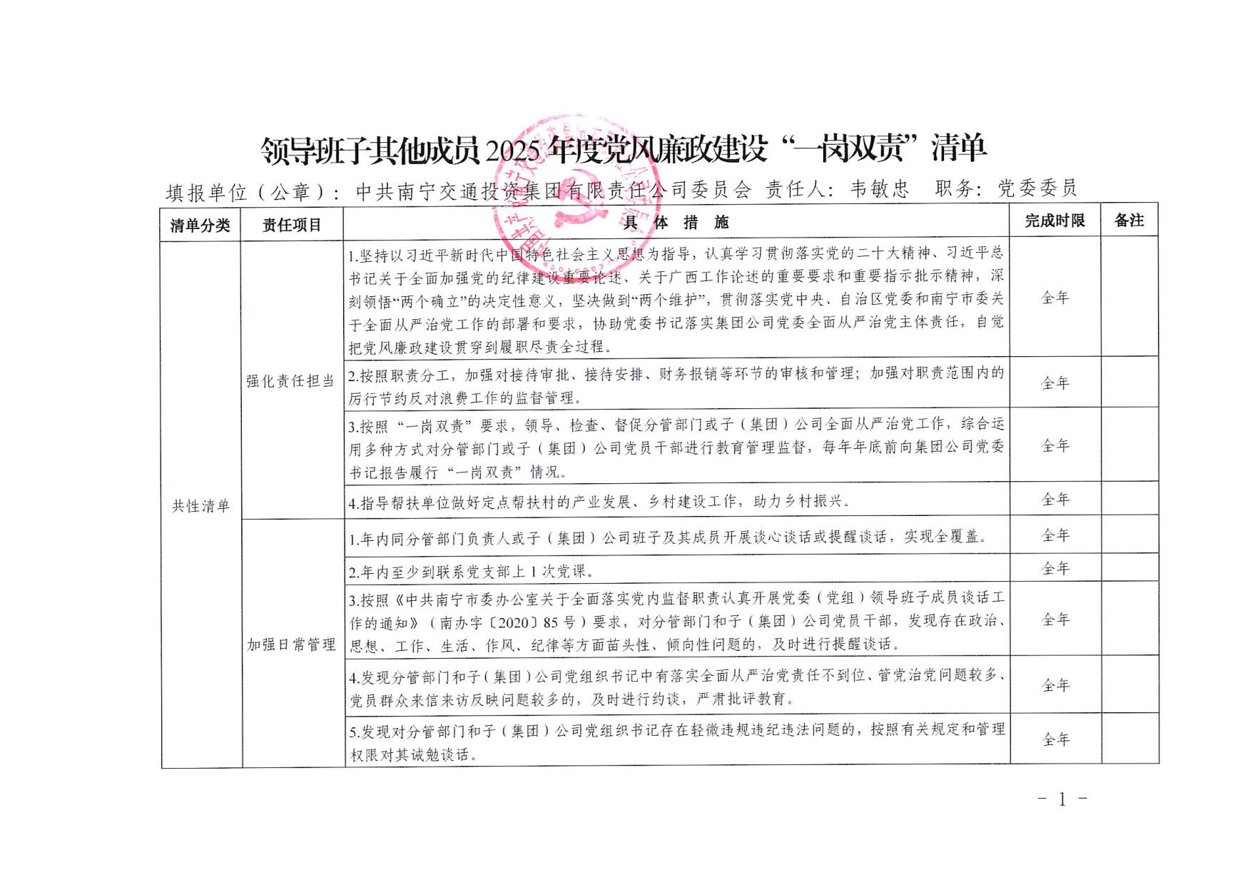 南寧交投集團(tuán)領(lǐng)導(dǎo)班子其他成員2025年度黨風(fēng)廉政建設(shè)“一崗雙責(zé)”清單(八)