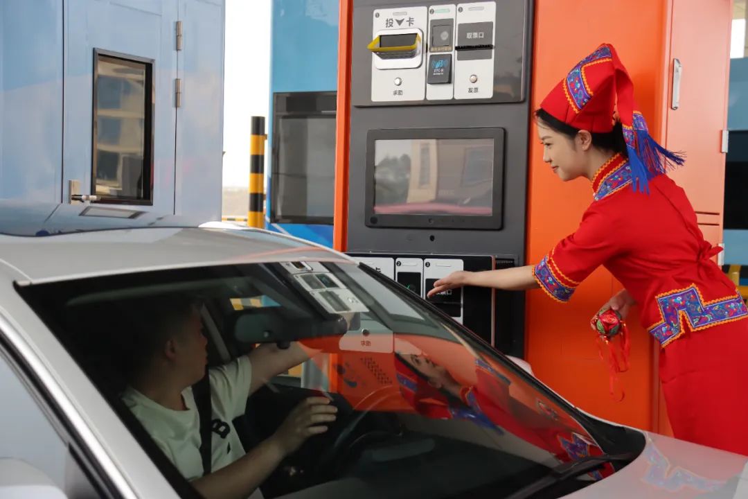 在上橫收費(fèi)總站,當(dāng)班人員身穿特色民族服裝,化身“阿哥”“阿妹”,以嶄新靚麗形象迎接廣大司乘,以傾心的微笑開展文明服務(wù),將民族特色與收費(fèi)窗口服務(wù)相融合,成為高速路上一道靚麗風(fēng)景線。
